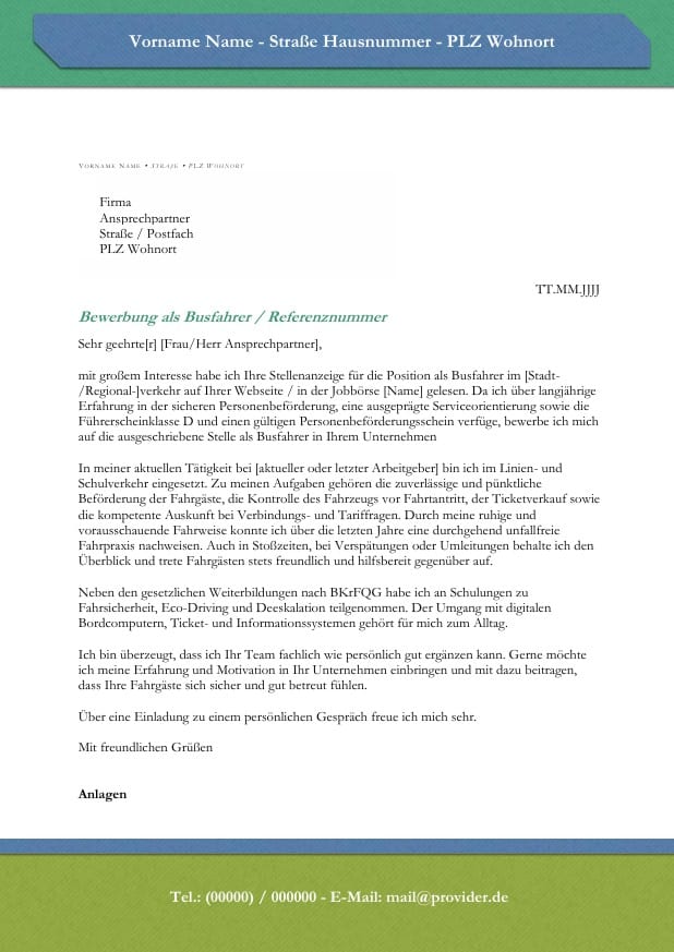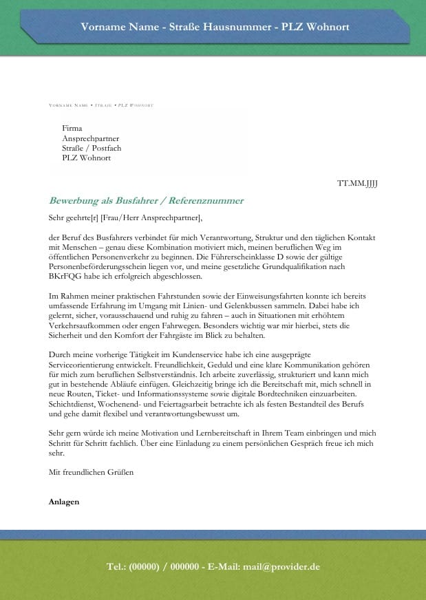 Starten wir mit dem entscheidenden ersten Schritt: dem Bewerbungsschreiben. Tauchen Sie ein in die Welt des Linienverkehrs, des Kundenservice und der sicheren Personenbeförderung, damit Ihre Bewerbung als Busfahrer die Pole-Position im Auswahlprozess einnimmt. Bleiben Sie dran – wir bringen Ihre Karriere im ÖPNV und Reiseverkehr ins Rollen!