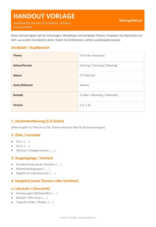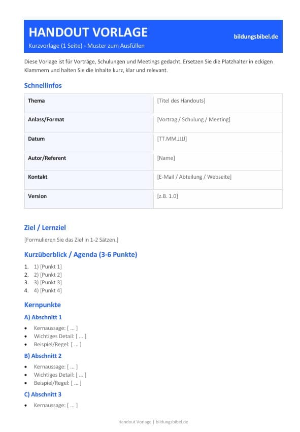 Hier erhalten Sie zwei Varianten: eine Kurzvorlage für eine Seite und eine ausführliche Handout Vorlage für längere Inhalte. Kopieren Sie den Text, passen Sie ihn an und behalten Sie die Struktur bei.