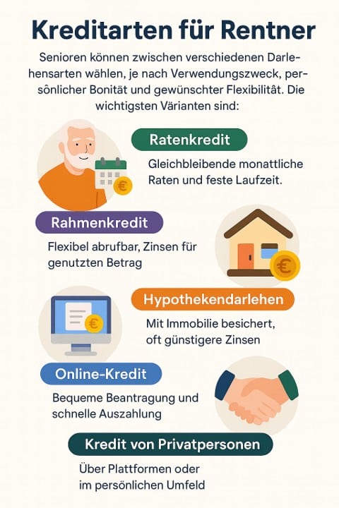 Rentner können zwischen verschiedenen Kreditarten wählen, je nach Verwendungszweck, persönlicher Bonität und gewünschter Flexibilität. Die wichtigsten Varianten sind: