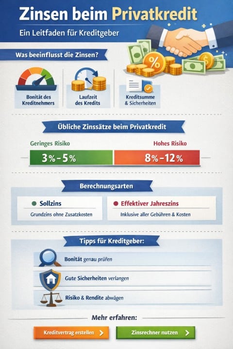 Wenn Sie einen Privatkredit vergeben, sollten Sie die Zinsen beim Privatkredit nicht als Nebensache behandeln. Der beste Zinssatz ist der, der zu Risiko, Laufzeit, Absicherung und Beziehungsebene passt – und den Sie bei Bedarf in einem Satz erklären können.